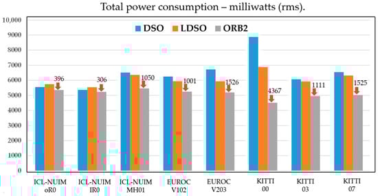 Hardware capabilities: The computational capacity of onboard processors and co-processors determined the feasibility of deploying computationally intensive algorithms for real-time VSLAM. Additionally, power consumption and heat dissipation presented constraints on embedded system design [36]. The available onboard memories limited the duration and resolution of mapping sessions, while communication bandwidth impacted multi-robot collaborative mapping capabilities. YANIK, et al. [37] conducted an evaluation and comparison of three visual SLAM methods—ORB-SLAM2, direct sparse odometry (DSO), and DSO with loop closure (LDSO)—in terms of energy consumption and resource usage, as shown in Figure 3.