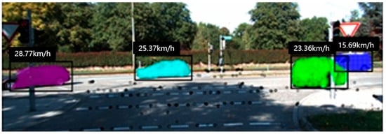 VDO-SLAM [85]: Utilizing Mask R-CNN for instance segmentation and object tracking, this method excluded objects exhibiting independent motion from ego-motion estimation between frames. VDO-SLAM integrated optical flow or alternative object tracking techniques to monitor objects across consecutive frames. This strategy facilitated the tracking of dynamic objects during camera pose estimation, thereby enhancing the efficacy of visual odometry in dynamic environments. This approach effectively elevated the performance of visual odometry, particularly in intricate environments with a significant presence of dynamic objects. Figure 6 shows the dynamic tracking and recognition of vehicles.