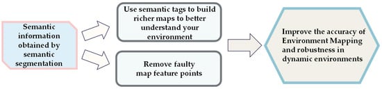 Visual odometry played a pivotal role in the VSLAM pipeline, aiming to estimate the incremental camera motion between consecutive frames. Traditional visual odometry relied on tracking and matching low-level geometric features, including points, lines, or keypoints, across frames to compute changes in camera pose [83]. However, these low-level features lacked semantic understanding of the 3D environment, hindering their ability to distinguish between static and dynamic elements in complex environments encompassing both background structures and independently moving objects. Figure 4 illustrates the optimization process of semantic segmentation for visual odometry. Features originating from moving objects could compromise the accuracy and robustness of visual odometry.