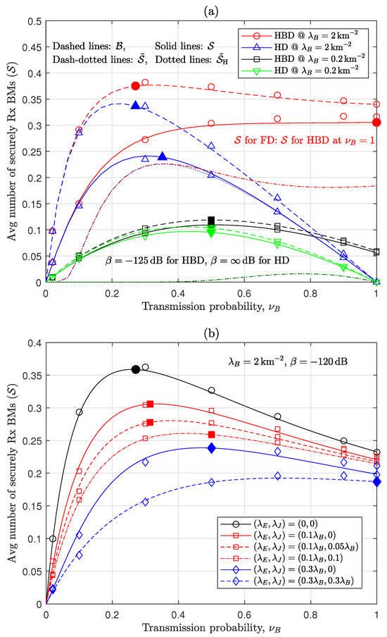 The PLS offers advantages in the context of wireless networks by leveraging the inherent characteristics of physical medium [13], thus providing security that is inherently robust against eavesdropping without the complexities and vulnerabilities associated with key management and algorithmic encryption in conventional cryptographic methods. This makes PLS particularly suitable for dynamic and resource-constrained environments, such as wireless sensor, IoT, V2V, and D2D networks [14,15]. In order to confound Eves more actively, a legitimate transmitter and friendly jammer send artificial noise (AN) for impairing Eves’ link [14,15,37]. However, AN may be rather harmful to other nearby legitimate nodes in wireless networks because jamming signals raise interference. In this regard, through applying stochastic geometry theory, network-wide secrecy performances have been analytically quantified in various scenarios, e.g., the millimeter wave ad hoc network [38], three dimensional IoT networks [39], covert communication in D2D networks [40], vehicular networks [41], and uncoordinated random jamming in wireless sensor networks [42]. Further, several studies investigated the effect of an FD jamming approach, where FD nodes receive informative data from their transmitter while simultaneously sending AN for confounding Eves [19,20], in terms of strengthening network-wide secrecy performances in wireless distributed networks [21,22], under stochastic geometry frameworks. In particular, the work of [22] demonstrated that FD jamming impacts PLS performance depending on RSI level and proposed a switchable FD/HD mode. Hence, they concentrated on enhancing security by impairing the connections to these Eves while preserving the quality of the link to an intended receiver. In contrast, the WMB studied in this paper experiences inevitable performance degradation due to jamming, because both receivers and eavesdroppers remain unknown. This lack of information significantly makes the PLS in WMB challenging. The work of [11] analytically investigated the spatial secrecy performance of RA-WMB networks and demonstrated that simply adjusting a fraction of transmitters, by controlling transmission probability (TxPr), improved PLS performance. However, it did not consider FD operations with SIC.