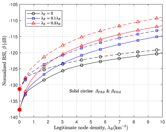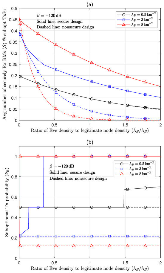 Based on the comprehensive findings presented in this paper, Table 1 provides a concise summary and comparison of the design principles of TxPr, which determines the operations of WMB nodes for various RSI levels ranging from 0 to ∞, between secure and nonsecure RA-WMB approaches. Note that the HD performance in [11] is equivalent to the HBD performance with an infinite RSI level in the model analyzed in this paper. In this table, and denote the spatial densities of legitimate nodes and Eves, respectively, and and denote the optimal proportion of legitimate nodes transceiving with SIC (i.e., TxPr) and the amount of RSI, respectively. (Hence, the proportion of legitimate nodes receiving without SIC becomes . Furthermore, the properties of are inferred from its suboptimal values and numerical results.) Further, and denote the values of required for the FD optimality and superiority, respectively. The notations are described in Table 2, which also lists the parameter values used for the numerical results in Section 6.