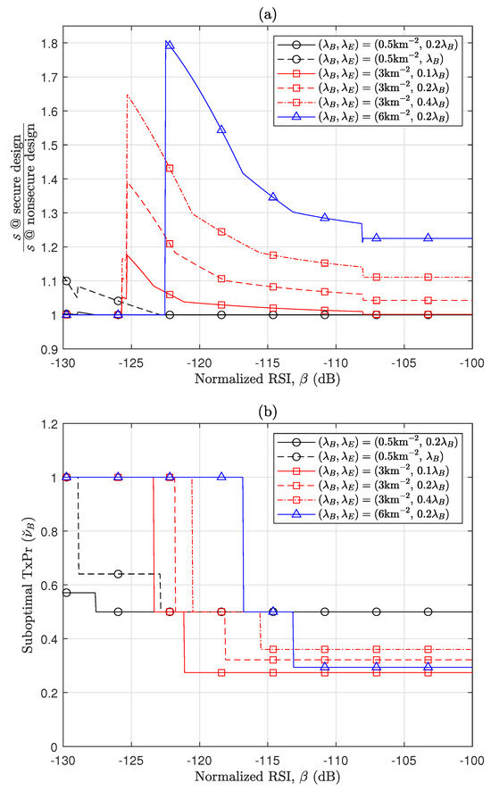 In a coverage-limited scenario where the impact of interference is ignored, e.g., a sparse node distribution scenario, can be expressed in a quite simple form like (14) and (15). Interestingly, Proposition 1-(iv) also gives the optimal for and , which does not depend on . This signifies that there is no difference between secure and nonsecure designs when legitimate nodes are sparse. Section 6 will demonstrate that secure design plays a more crucial role in improving secrecy performance as interference increases. However, designing in nonzero interference scenarios is not straightforward, which will be thoroughly addressed in Section 4.1. The optimal in (16) increases with , and this implies that the HBD RA-WMB moves toward the FD RA-WMB as RSI decreases. On the other hand, as , goes to zero, and this leads that the optimal for HD RA-WMB becomes . This result is consistent with the design in [29] that maximizes the nonsecure performance of HD RA-WMB.