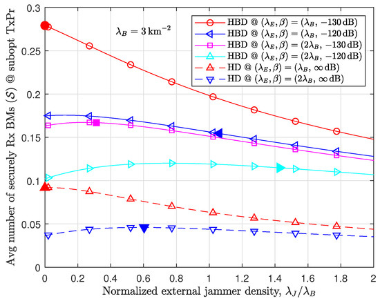 An external jamming signal may contribute to increasing . In particular, is useful for a high Eve density. For example, in an interference-limited scenario with and , when , is maximized at and , where .
