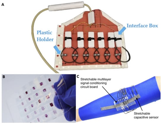Many design limitations inherent to stretchable sensors stem from a fundamental understanding of material handling, surface adhesion, and selection mismatch. To further the development of flexible sensors in general and stretchable MRI coils in particular, it is crucial to revisit current advances and challenges in established substrate materials such as elastomers, glass, hydrogels, and thermoplastics. There are many potential materials to be fully explored. Some of the most common stretchable sensor composites consist of thermoplastic polyurethane (TPU) or rubbers such as polydimethylsiloxane (PDMS). These materials have been studied extensively for their benefits in terms of elasticity, dielectric permittivity, optical transparency, biocompatibility, and biostability [65,66]. An example of a stretchable sensor composite can be seen in Figure 2A–C.