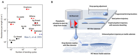A stretchable sensor requires a conductor that can elongate with the increase in sensor size. Thus far, in the literature, such “stretchable” conductive materials include both emerging material formulations (i.e., liquid metal, natural resins, and metamaterials) and conventional materials (i.e., copper, silver (Ag) flakes, graphene, and carbon-based materials). Alternative, “stretchable”, conductor materials that can be used in flexible electronics must have sufficient electrical conductivity to maximize SNR and sensor sensitivity [36] (see Figure 3A). In the following section, we specifically examine the electrical conductivity of different stretchable conductors.
