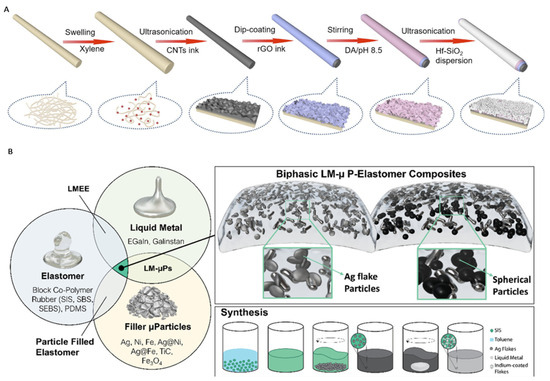 Luo and Zhou reported having successfully prepared a flexible conductive ternary composite consisting of silicone, liquid metal, and iron particles, resulting in a composite system with superior elastic performance, excellent repeatability, microstructure stability, formidable conductivity, and high breaking elongation [147].