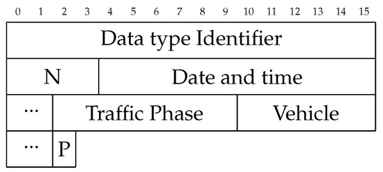 Each portion of traffic data contains at the minimum 37 bytes. A datatype identifier is first, identifying which type of data comes next. For intersection data, this consists of a 32-bit (4 byte) unsigned integer indicating the number of data points being sent, N. Following are N frames consisting of 14 bytes for the date and time, 8 bytes for the traffic phase, 64 bits (8 bytes) for the vehicle detection sensors, and 8 bits for the pedestrian detection sensors, as shown in Figure 5. Even assuming each intersection sending a single frame, every second, 500 intersections would be 17.5 Kb/s. If the connection was dropped after each frame, the most data sent would be the connection and authentication.
