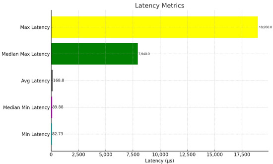 To measure the performance of data acquisition, we added timing commands to the edge client. A total of 80.05 megabytes of intersection data were transmitted (not including encryption), with an average latency from data acquisition to server of 0.1688 ms. The minimum latency from all intersections was 82.73 μs, with a median minimum of 89.88 μs. The maximum latency was 18.95 ms, with a median maximum of 7.94 ms, as illustrated in Figure 7.
