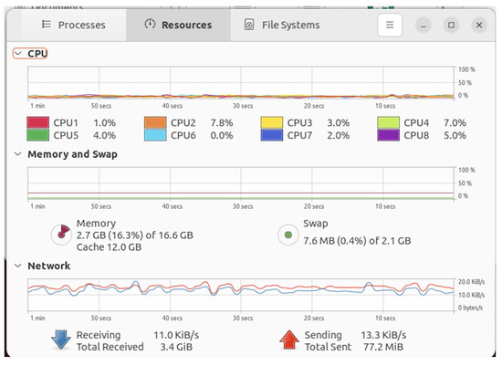 A consumer-grade desktop with an i7-7700 CPU running 20.04 Ubuntu Linux was very capable of capturing and storing the aggregated data, with each thread staying well under 30% usage, as shown in Figure 9.