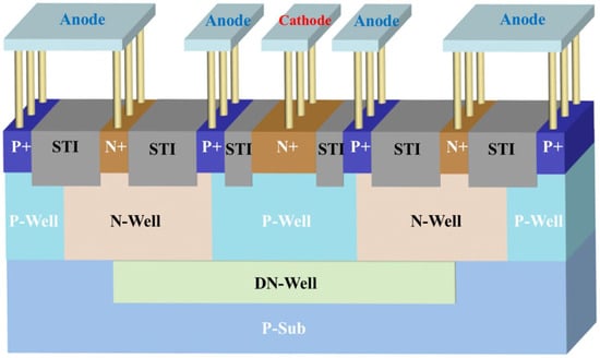 The 3D structure of the photodiode (PD) device, designed and fabricated using a 0.18 µm standard CMOS process, is shown in Figure 1. The N+ region serves as the cathode of the device, and the P+ region serves as the anode of the device. From Figure 1, it can be seen that there are three vertically oriented PN junctions in the figure, one formed through the N+/P-Well contact surface, one formed via the DN-Well/P-Well, and one formed via the DN-Well/P-SUB and the inverted PN junctions formed in the edge region, which effectively mitigates the effect of the substrate noise carriers on the device and reduces the dark current. When light is irradiated on the surface of the device, photons larger than the energy of the silicon band gap will be absorbed via the material. As a result, electrons in the valence band jump to the conduction band, forming photogenerated carriers. These photogenerated carriers form a stable photocurrent under the action of electric field force.