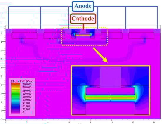 The operating principle and structure of the device, including the electric field distribution and current distribution of the device, were simulated and verified using the silvaco TCAD tool. In the simulation, a bias voltage of 2 V was applied to the cathode of the PD device, and the anode was 0 V. Figure 2 shows the simulation results of the electric field strength during normal operation, and it can be seen that the maximum value of the electric field strength was mainly concentrated at the PN junction formed via the N+/P-Well with an electric field strength of about 2.7 × 105 V/cm.