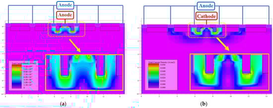 (a) Current distribution of PD device under dark conditions; (b) current distribution of PD device under light conditions.