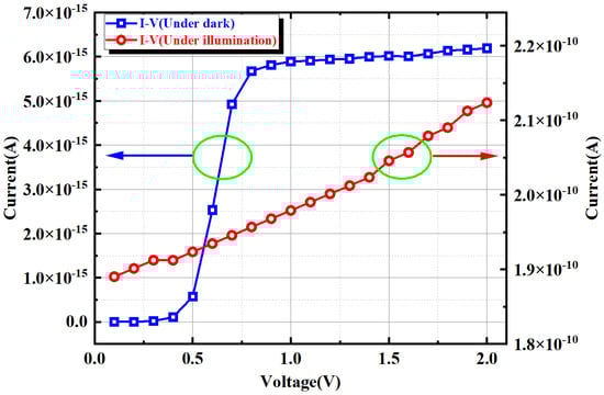 The total current density distributions of the PD device under dark and light conditions are shown in Figure 3. Under the light condition, the total light current density of the PD device was 5.6 × 10−2 A/cm2, which was significantly higher than the dark current density of 1.2 × 10−6 A/cm2. Figure 4 depicts the simulated current–voltage (I-V) characteristics of the PD device. The reverse-bias voltage varied from 0 V to 2 V, and the resulting I-V curves are plotted in blue for the dark condition and in red for the illuminated condition.