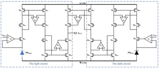 The main function of the ambient light sensor is to convert weak light signals into electrical signals and amplify them to the desired level in order to achieve proper signal processing in the ambient light sensor system. A simplified block diagram of the designed ambient light sensor circuit is shown in Figure 5, which mainly consists of PDLight, PDDark, an operational amplifier, a reference-source circuit, and a logic-control circuit. The operational amplifier amplifies the output photocurrent signal of PDLight. The reference-source circuit provides reverse-bias voltage, VREF, to the PDLight and the reference current to the operational amplifier. The logic-control circuit provides three selectable output-current gain modes. The PDLight operates at the reverse-bias voltage, VREF, and shows a linear relationship between its output current and light intensity. The PDDark operates in dark conditions to compensate for the dark current. The output port IOUT is connected to the resistor RL to convert the current signal into the voltage signal.