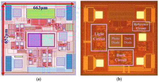 The programmable ambient light sensor with dark current compensation and a wide dynamic range proposed in this paper was designed and fabricated using a 0.18 µm standard CMOS process. The layout and micrographs of the circuit are shown in Figure 7. The effective area of the chip is 663 µm × 652 µm.