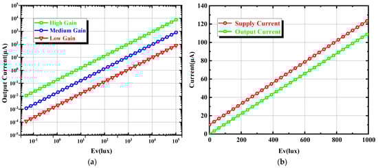 The measurement results of the output current with the change in light intensity are shown in Figure 8a, which shows that, when the supply voltage is 3.3 V and the light intensity is increased from 0 lux to 100 K lux, the output current changes linearly with the light intensity, the output current increases linearly, and the step size is 10 times in three different operating modes. When the light intensity increases from 0 lux to 1 K lux, the measurement results of the power-supply current and output current with the change in light intensity are shown in Figure 8b, which shows that both the power-supply current and output current change linearly with the light intensity. From the measurement results, it can be seen that the programmable ambient light sensor proposed in this paper has a wide dynamic range and good linearity.