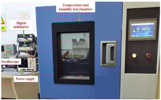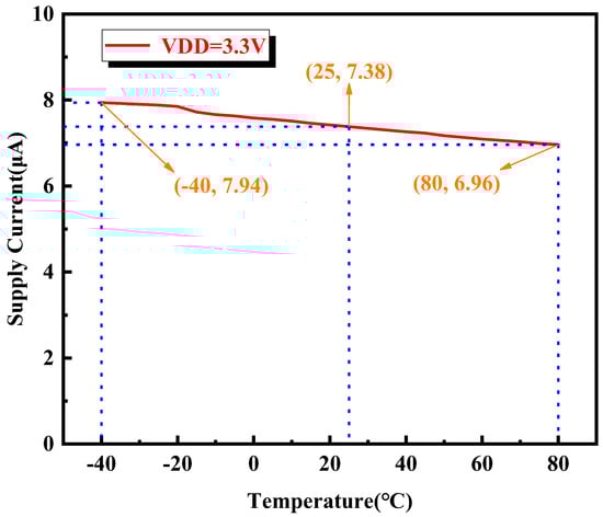 The temperature characteristics of the ambient light sensor were measured using a temperature and humidity test chamber, as shown in Figure 9. The measurement results of the power supply current with temperature changes in a dark environment are shown in Figure 10. From the figure, it can be seen that, when the supply voltage is 3.3 V and the temperature is −40 °C, the maximum power supply current is 7.94 µA. When the temperature is 80 °C, the minimum power supply current is 6.96 µA. When at room temperature, the power supply current is only 7.38 µA. It can be seen from the measurement results that the programmable ambient light sensor proposed in this paper has low current consumption across the whole operating temperature range.