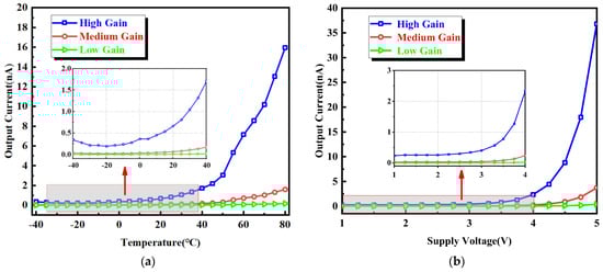 The measurement results of the output current changing with the temperature in a dark environment are shown in Figure 11a. As can be seen from the figure, when the temperature is −40–40 °C, the output dark current is very small, and when the temperature rises to 40 °C, the output dark current begins to increase gradually. This is mainly because, as the temperature increases, the dark current of the two photodiodes increases sharply, resulting in a large difference in the size of the dark current. When the circuit works in High Gain mode, the current magnification is 100,000, and the output dark current is only 16 nA at the temperature of 80 °C. The measurement results of the output current changing with the power supply voltage in a dark environment are shown in Figure 11b. It can be seen from the figure that, when the power supply voltage is 1–4 V, the output dark current is very small, with a maximum of only 2.3 nA. When the supply voltage is increased to 4 V, the output dark current begins to rise. This is mainly because the power supply voltage is 3.3 V when the CMOS tube is working normally, and continuing to increase the power supply voltage may lead to an increase in the leakage current. The measurement results demonstrate that the proposed circuit effectively mitigates the influence of the dark current. A comparison table with previously published designs is shown in Table 2. In contrast to the present approach, none of the previously published designs proposed dark current compensation.