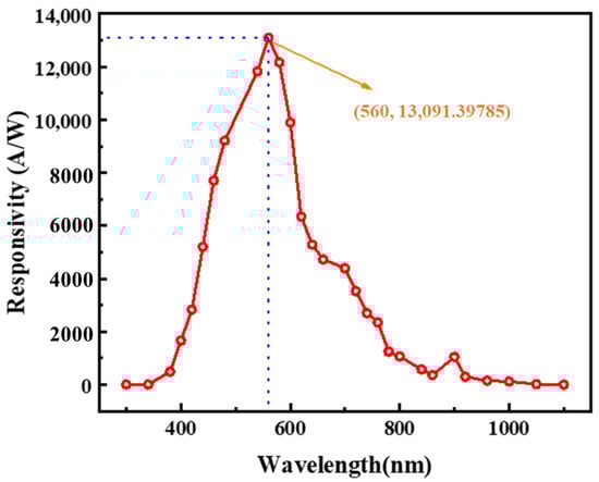 The output current of the circuit is recorded as the light source wavelength varies from 300 nm to 1100 nm, with a power supply voltage of 3.3 V and a PDLight reverse-bias voltage of 0.8 V. The output current is then divided by the optical power at each wavelength to obtain the spectral response of the circuit, as shown in Figure 12. The optimal spectral response occurs between 500 nm and 600 nm, reaching a peak of 13,091 A/W at a wavelength of 560 nm.