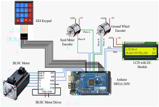 The driving shaft of the seed-metering plate in each row unit was coupled to the output shaft of the respective BLDC motor (Rhino Motion Control Solutions, RMCS-2025, Pune, India). All four BLDC motor drivers were connected to the Arduino Mega through strip wires. The circuit diagram is presented in Figure 1. The microcontroller regulated the drivers (Rhino Motion Control Solutions, RMCS-3002, Pune, India) of the BLDC motors to supply the voltage necessary to neutralize the error. The voltage was regulated by a digital PWM signal created by the microcontroller. The PID technique was incorporated into the feedback loop to rectify the error RPM efficiently. The PWM value was regulated through PID to reach the set point within a quick response time. The Arduino Mega was programmed using the open-source Arduino IDE 1.8.19 platform to perform the above task.