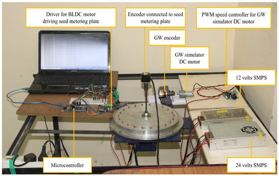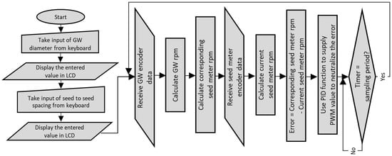 The introduction of a feedback loop system can provide better regulation of the RPM of the seed metering plate. Therefore, another optical incremental encoder (encoder 2) was coupled to the driving shaft of one of the seed-metering plates. This encoder was used to measure the RPM of the seed-metering plate in real time and feed it to the system. Thus, the required RPM as per encoder 1 and the current RPM as per encoder 2 could be compared each time to calculate the RPM value to be increased or decreased at the seed-metering plate. This value was considered the error.