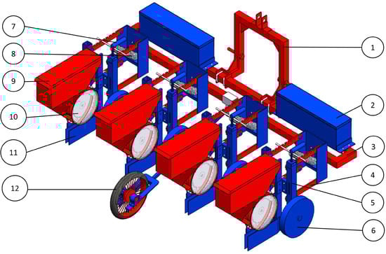 Designed electronically controlled and operated tractor-drawn four-row pneumatic cotton planter. (1: three point hitch, 2: battery box, 3: main frame, 4: parallelogram linkage, 5: H frame, 6: gauge wheel, 7: depth control handle, 8: tension spring, 9: hopper, 10: seed metering unit, 11: furrow opener, 12: auxillary ground wheel).