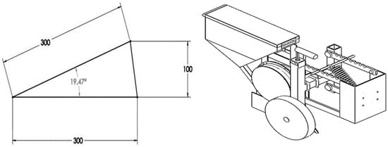 A parallelogram linkage system was engaged between the main frame and each row unit. A side gauge wheel performs better than a rear or front gauge wheel []. A depth gauge attached to the side of each seed-metering unit was provided for depth adjustment and maintenance []. An adjustable tension spring acts on the parallelogram linkage system to press the row unit down until the depth set at the gauge wheel is achieved. This maintains the set depth while providing adequate stability to the row unit []. The spring tension can be varied as per soil conditions and type by shifting its movable end. The upper two bars of the parallelogram system have been provided with seven steps to change the spring tension. A downforce higher than 600 N is required to achieve better uniformity in depth []; the dead weight of the hinged row unit and spring tension force must reach this value. The dead weight of the hinged part of a row unit is 382.32 N and the remaining force of 217.68 N is required to be supplied by spring tension. The spring has been designed to provide the above force when elongated and engaged with the first step. A bracket was developed to serve as a hinged support for the parallel linkages, a fixed support for one end of the spring, and a connector for the row unit to the main frame. The other end of the parallel linkage was hinged to the H-shaped frame, which holds the depth regulation system. The center-to-center distance between the hinged points of all parallel linkages was kept at 300 mm, as a lower change in angle is desired when the parallel linkages are working [,]. The associated maximum angle and single row unit of the planter are shown in Figure 6. The depth can be regulated by rotating the handle connected to a screwed shaft. The screwed shaft lifts or lowers the movable square box on which the gauge wheel is mounted. The movable square box fits inside the H-shaped frame that guides it. The furrow opener operates with reference to the gauge wheel and, thus, higher or lower depths can be achieved by lifting or lowering the gauge wheel, respectively. The developed planter is shown in Figure 7.