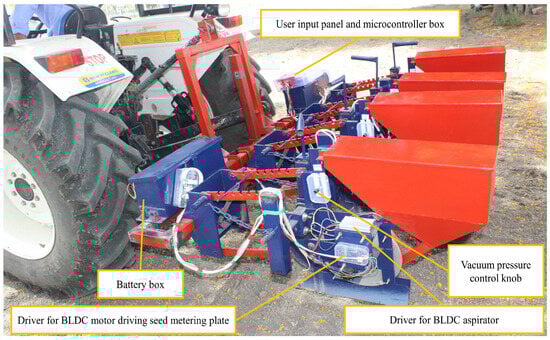 Individual BLDC motors were used to replace mechanical systems for easy adjustment and reduced vibration. The comparative performance of pneumatic planters with different types of aspirators and seed-metering drives shows the enhanced performance of the developed model. A quality feed index of 93% and precision index of 8.01% were achieved in the laboratory, using an orifice diameter of 2.947 mm, vacuum pressure of 3.961 kPa, and forward speed of 4.261 km/h. The quality feed index and precision index values obtained in the field were 88.8 and 12.75%, respectively. The lower difference between laboratory and field performance was achieved through reduced source vibration through adopting an independent BLDC motor-based aspirator and seed-metering-plate driving system for each unit. This also provided better flexibility in the adjustment of vacuum pressure, seed spacing, depth, and row spacing, and produced less vibration. The demand for such electrically powered and easily adjustable farm equipment will rise with newly evolving electric tractors and solar-powered or hybrid agricultural vehicles. In large-scale manufacture, electronic circuit components can be substituted with printed circuit boards to provide dependable and resilient functionality. Retaining a redundant printed circuit board is cost-effective and can enhance reliability.