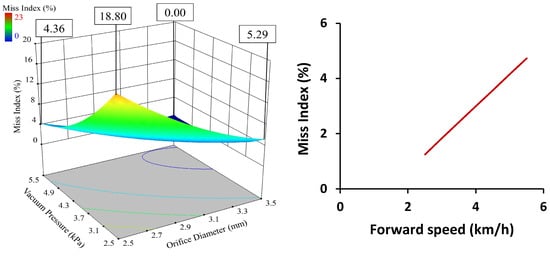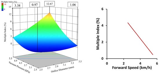 An increase in forward speed caused the multiple index to decrease. The seed and seed-metering plate interaction time reduced with increased forward speed. The required acceleration of seed to obtain the kinetic energy of the seed-metering plate also increased. This occurred as the picking time reduced and the peripheral velocity of the metering plate increased. The same suction force was unable to provide the required acceleration to seeds at higher speeds, which reduced the multiple index and increased the miss index. The interaction of orifice diameter and vacuum pressure was revealed to influence the multiple index at a 1% level of significance. This interaction was expressed through the significant changes in the multiple index value when the vacuum pressure changed at a constant value of orifice diameter, or vice versa. The graph presented in Figure 8 clearly shows the phenomenon, which occurred because an increase in orifice diameter increased the multiple index by providing more suction area, greater area of contact between the seed and seed-metering plate, and also increased suction force. Similarly, increased vacuum pressure increased the multiple index through a stronger suction force and area. A change in any one parameter was able to overcome the effects of the others in a significant way. The interaction of orifice diameter and vacuum pressure was revealed to influence the miss index at a 1% level of significance. This interaction was expressed through the miss index value changing significantly when the vacuum pressure changed at a constant value of orifice diameter, or vice versa (Figure 9). This is because an increase in orifice diameter reduced the miss index by providing more suction area, increased area of contact between the seed and seed-metering plate, and greater suction force. Similarly, increased vacuum pressure reduced the miss index through increasing the suction force and area. A change in any one parameter was able to overcome the effects of the others. The multiple index was found to be affected by orifice diameter, vacuum pressure, and forward speed at a 1% level of significance.