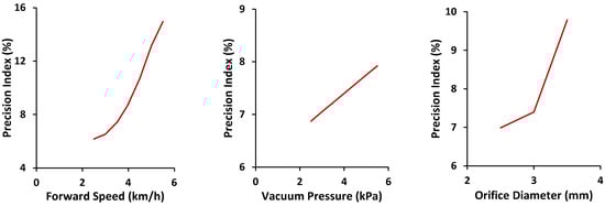 Effects of independent parameters on precision index against forward speed (left), vacuum pressure (middle), and orifice diameter (right).