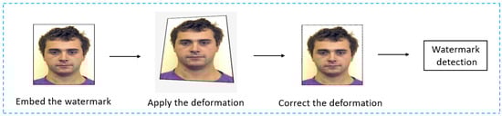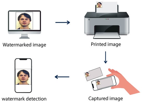 Here, we watermarked 500 ID images sourced from the PICS [] database. Simulated print-cam attacks were executed and perspective correction was subsequently applied. All comparative methods were performed following uniform conditions and protocols. The testing procedure is illustrated in Figure 9.