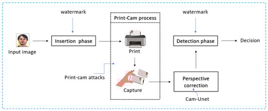 The watermark is initially inserted into the cover image. Following the print-cam process, the captured image undergoes perspective correction. Subsequently, during the detection stage, a decision is made regarding whether the rectified image contains the watermark or not. The proposed watermarking method is illustrated in Figure 2.