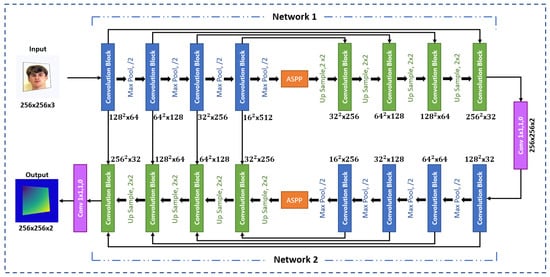 In the view of Figure 3, the architecture consists of two main networks, labeled Network 1 and Network 2. Each network follows the same structure, starting with an encoder sub-network (marked in blue) followed by a decoder sub-network (marked in green). In the first network (Network 1), a three-channel input image is initially processed by the encoder. The resulting output is then subjected to further processing through the ASPP module. Following this, the decoder concatenates the output from the ASPP module with skip connections from the encoder. In the second network (Network 2), the encoder operates on a 2-channel input derived from the previous network (Network 1). Afterward, The encoder output is fed into the ASPP module. The decoder then concatenates the output from the ASPP module with skip connections from both encoders. Finally, the prediction yields an output with two channels.