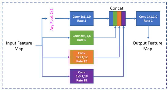 The ASPP module, illustrated in Figure 4, includes an adaptive average pooling layer followed by convolutional layers with different dilation rates and a final convolutional layer to fuse the features. This helps to accurately predict pixel-wise labels, particularly in complex scenes where data can vary considerably in size and shape. Consequently, by aggregating information from multiple scales and spatial locations, the ASPP module enriches the feature representation, which is then passed on to the decoder.