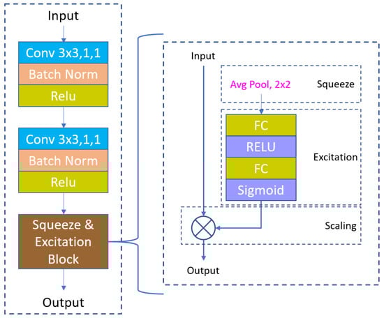 Figure 5 shows the design of the convolution block used in the architecture. Each block performs two 3 × 3 convolution operations, followed by a batch normalization to reduce internal covariate shift and regularize the model. Subsequently, a rectified linear unit (ReLU) activation function is employed to introduce non-linearity. The squeeze-and-excitation block, applied after the convolutional layers, modulates channel-wise responses to highlight informative features. Notably, max-pooling is conducted with a 2 × 2 window and stride of 2 after each encoder convolution block, while a 2 × 2 bi-linear upsampling operation is performed before each decoder convolution block. The first decoder employs skip connections from the convolutional blocks of the first encoder, whereas the second decoder integrates skip connections from the convolutional blocks of both encoders to maintain spatial resolution and improve the quality of the output feature maps. At the end of the architecture, a convolution layer is applied to generate the final output prediction.