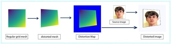We plan to use synthetic data for training, a common practice observed in recent deep-learning systems [,]. The approach involves directly creating training images in 2D, which can be more accessible and computationally efficient compared to manipulating 3D meshes. This enables faster image generation and allows for greater control over the dataset generation process. Furthermore, synthetic data generation makes it possible to create deformations covering a wide range of scenarios, including those that may be difficult to capture in real-world data. In this work, the main objective is to map from a distorted image to its rectified state. In contrast, the data synthesis process is entirely inverse to this procedure.