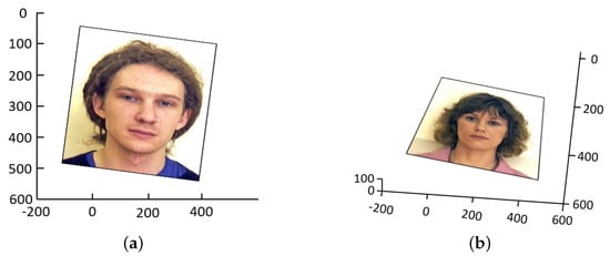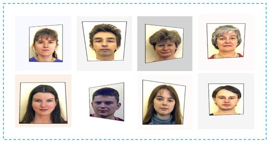 To simulate perspective distortions, we apply a combination of 3D rotation to the image across the x, y, and z axes, along with variations in the viewpoints of the camera, defined by polar angles and . These angles determine the viewpoint relative to the scene, with representing the polar angle in the plane and denoting the angle below or above the plane. This simulation is intended to generate the typical distortions observed in images taken freehandedly with a smartphone. Hence, we randomly select rotation values for the x and y axes in the range −5° to 5°, while for the z-axis we choose between −10° and 10°. Similarly, the viewpoint values of and are randomly chosen within the ranges [0°, 10°] and [60°, 90°], respectively. The next figure (Figure 10) shows samples of simulated perspective distortions.