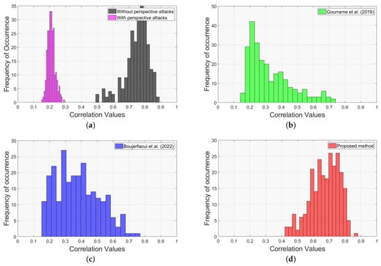 Empirical probability density functions of correlation values after perspective attacks rectification. (a) illustrates the ideal scenario (shown in black) in which no perspective attacks are present, and the worst case under perspective attacks (shown in pink). (b–d) illustrate the correlation results of the proposed method and methods in [,].