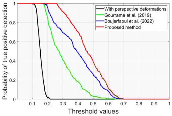 Probability of true positive detection as a function of the threshold values. The black line represents the worst-case scenario when perspective attacks are present. The other three lines represent the results of the proposed method and the other methods in [,].