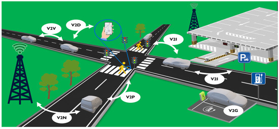 Intelligent transport systems (ITSs) define progressive topics of connected cars, connected automated driving, and vehicular communication systems which are expected to be game changers for future traffic mobility with further technological developments [1,2]. The main concern of ITSs is the increase in road safety and security by minimizing or fully avoiding human errors through the development of autonomous vehicles (AVs) [3]. It is unlikely that Avs can achieve their full potential without automating the vehicle’s communication with surrounding objects. This can be achieved through technological improvements in sensors that can sense the surrounding environment based on physical stimuli and a range of communication equipment that transmits collected and/or pre-processed data to nearby road users to ensure an efficient traffic cycle. Communication quality is one of the critical factors that determine the development of ITSs. According to [4], recent studies have analyzed and developed road safety and security in terms of latency and reliability. Research has also concluded that ITSs, because of wireless data transmission, encounter various attacks, e.g., signal hacking, that could lead to reduced autonomous driving performance. Therefore, the main communication attributes such as data authentication, availability, confidentiality, and real-time constraints must be taken into account. The concept of vehicular communication systems in the common literature is known more as vehicle-to-everything (V2X) communication, which has a wide range and covers different traffic elements, as shown in Figure 1.