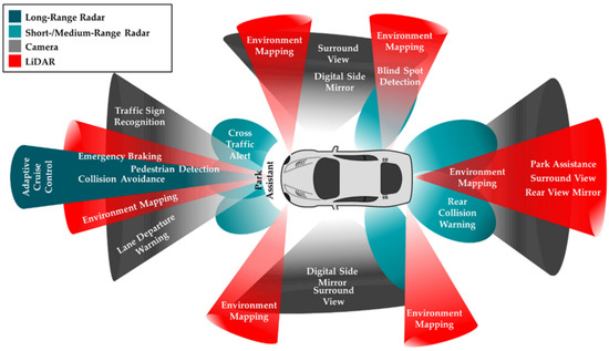 According to [29], sensors used in V2X communication can be classified into two groups: internal and environmental. Internal sensors measure such parameters as the vehicle’s motion, dynamic state, wheel speeds, and braking acceleration. Typical examples of internal sensors are accelerometers and gyroscopes. Environmental sensors monitor external objects like road signs and pedestrians. Typically for such applications, various cameras and radar-based sensors are used. In terms of sensing technologies, the evaluation of internal parameters is more developed and relies on older, reliable methods and technologies tested in various practical applications; contrary to environment sensing (Figure 3), there still exist many uncertainties requiring comprehensive research and validation.