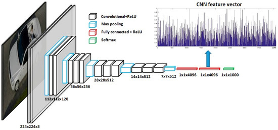 From Table 9 it can be noted that CNN-based ML architectures are used the most for object recognition and localization since images are used. In Figure 5, the example of CNN architecture when a bunch of images of different vehicles are used to recognize the absence of a vehicle is presented from [38]. As can be seen from these data, different CNN architectures can be built. For instance, in Figure 5, the network is composed of 13 convolutional layers, 5 pooling layers, and 3 fully connected layers, where ReLU is an activation function, and at the end, there is another activation function–Softmax. The key point before using this network is that the images have to be resized to the same dimension first.