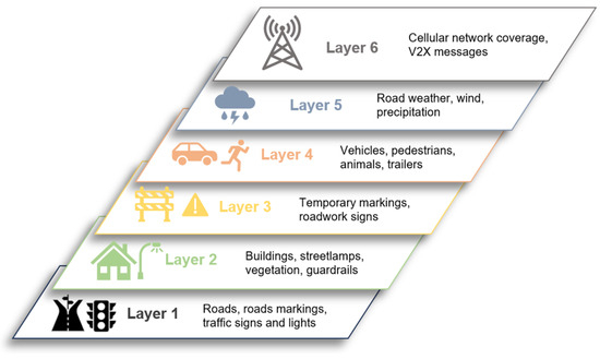 - Scholtes, M.; Westhofen, L.; Turner, L.R.; Lotto, K.; Schuldes, M.; Weber, H.; Wagener, N.; Neurohr, C.; Bollmann, M.H.; Kortke, F.; et al. 6-Layer Model for a Structured Description and Categorization of Urban Traffic and Environment. IEEE Access 2021, 9, 59131–59147. [Google Scholar] [CrossRef]