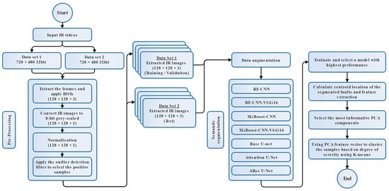 In this section, the key elements of the proposed methodology are described. A general flowchart of the procedure is presented in Figure 1. As part of the pre-processing steps, the overall quality of the datasets is improved. This is done before the models are trained and tested. Moreover, we describe the related procedures for training the studied models and select the best result for clustering of the segmented thermal faults. Finally, the associated steps for dimension reduction procedures and clustering are described.