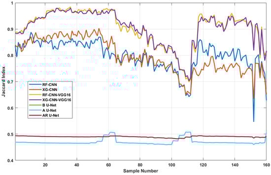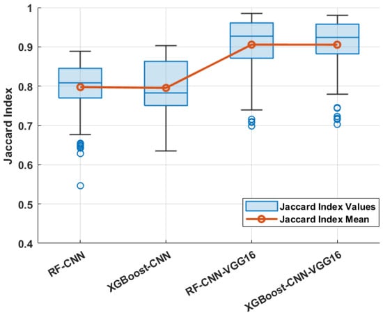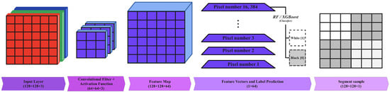 RF is considered an ensemble approach that includes multiple decision trees to make predictions based on input features. Based on the feature maps generated by the CNNs, the decision trees of the RF determined the pixel label. To do so, the extracted features from CNN models were used to train the RF. Moreover, to improve the accuracy of the final decision, a majority vote between the decision trees is employed. Using multiple decision trees can reduce the risk of overfitting; therefore, in this work, each tree randomly selected a subset of features from the whole available data to improve the final prediction [,].