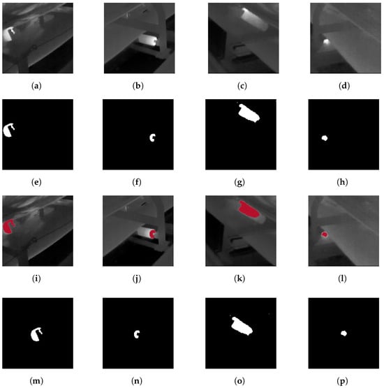 Examples of centralized segmented thermal defects based on the employed procedure. (a) Original ROI Sample 1, (b) Original ROI Sample 2, (c) Original ROI Sample 3, (d) Original ROI Sample 4, (e) Segmented label Sample 1, (f) Segmented label Sample 2, (g) Segmented label Sample 3, (h) Segmented label Sample 4, (i) Fault location Sample 1, (j) Fault location Sample 2, (k) Fault location Sample 3, (l) Fault location Sample 4, (m) Centralized label Sample 1, (n) Centralized label Sample 2, (o) Centralized label Sample 3, (p) Centralized label Sample 4.