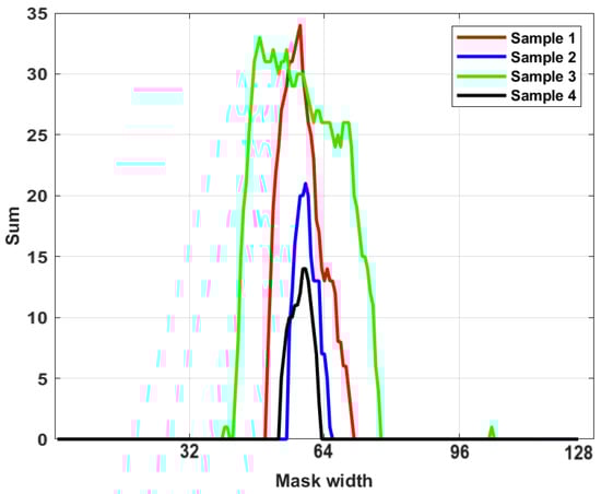 Different feature extraction methodologies can be used to extract proper features from a segmented frame for dimension reduction and classification purposes. The shapes of the segmented areas in processed frames can be different due to the severity of the extracted thermal faults. In the binarized segmented map, the intensity value of the pixels varies from black (0) to white (1). To extract features, we scan the pixels’ columns to look for trends that can help pick out novelty. Therefore, the column-wise summation of each frame is generated and considered a feature for the performance of clustering tasks (Figure 7).