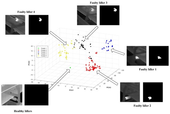 In this direction, we investigated the effectiveness of the studied clustering method on different thermal defects, as presented. In Table 5, we try to demonstrate how idler faults can share a similar pattern. The experimental results demonstrated that the combination of PCA and the K-means clustering methods is an efficient way of clustering thermal anomalies in highly overlapped IR image data.