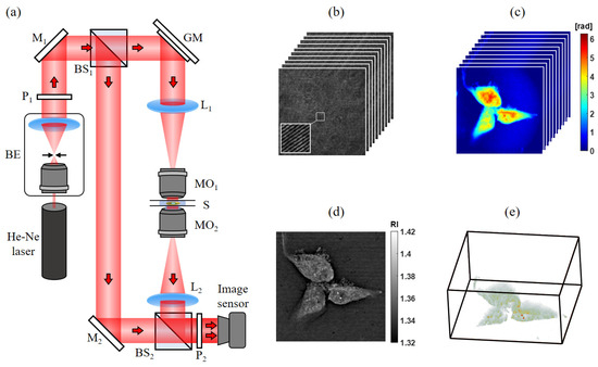 (a) Optical setup of HT. The experimental results of (b) a series of hologram acquisitions, (c) reconstructed phase, (d) sectional RI tomogram, and (e) 3D RI visualization. BE: beam expander; P: polarizer; M: mirror; BS: beam splitter; GM: galvo mirror; L: lens; MO: microscope objective; S: sample.