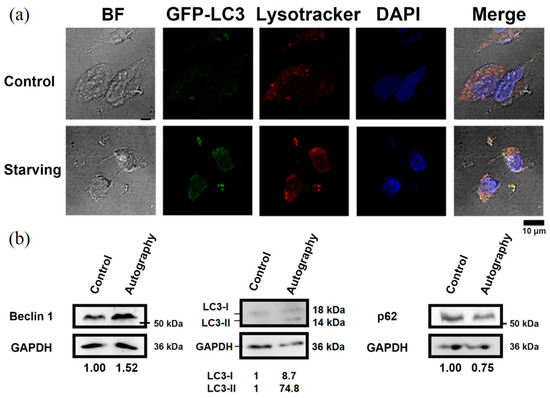 Serum starvation-induced autophagic SH-SY5Y cells. (a) Immunofluorescent images for bright field (BF), nucleus staining (DAPI), GFP-fused LC3 protein, and lysosome labeling (lysotracker) of cells. (b) Western blot analysis for Beclin-1, LC3, and p62 expression. The relative expression levels of proteins were quantified using Image J software. GAPDH levels were used as the internal loading control.